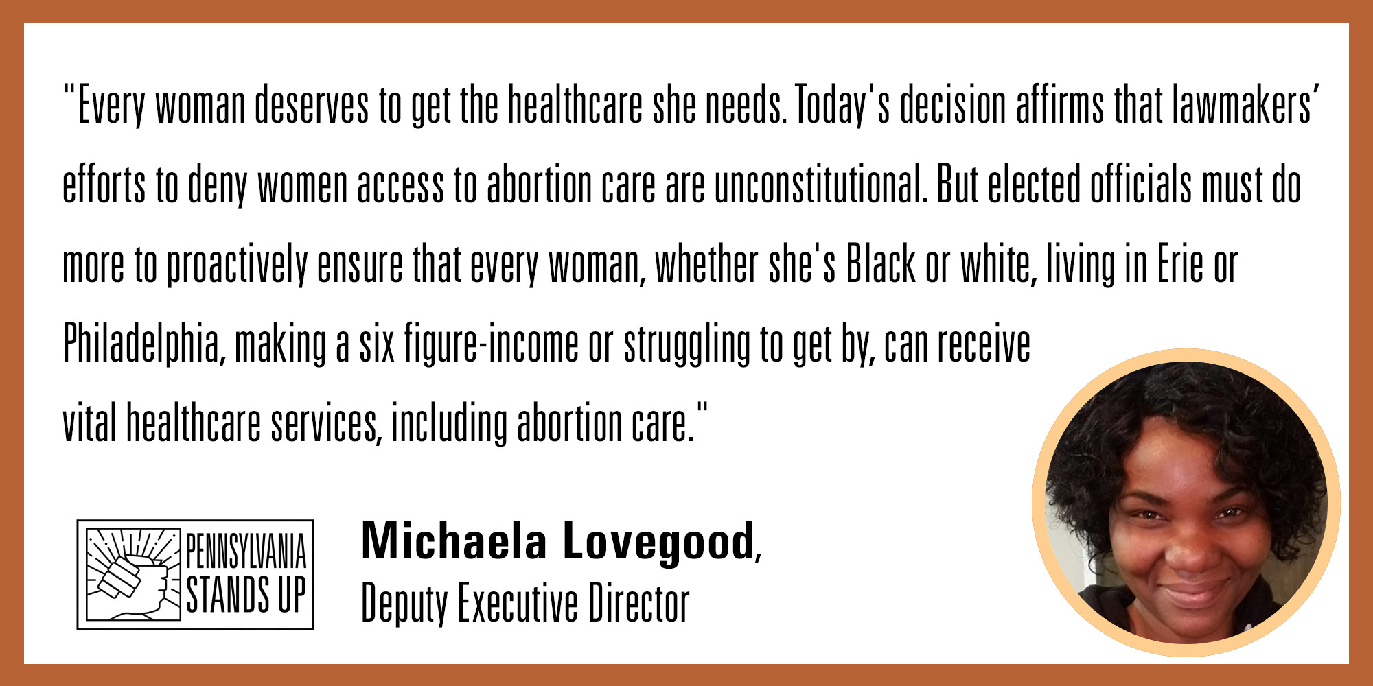"Every woman deserves to get the healthcare she needs," said Michaela Lovegood, Deputy Executive Director of Pennsylvania Stands Up. "Today's decision affirms that lawmakers’ efforts to deny women access to abortion care are unconstitutional. But elected officials must do more to proactively ensure that every woman, whether she's Black or white, living in Erie or Philadelphia, making a six figure-income or struggling to get by, can receive vital healthcare services, including abortion care."